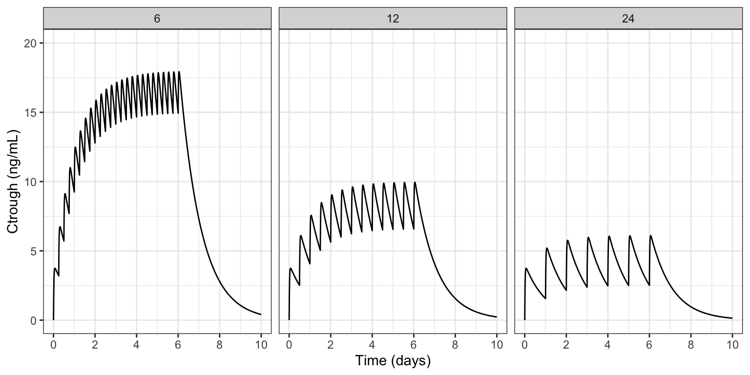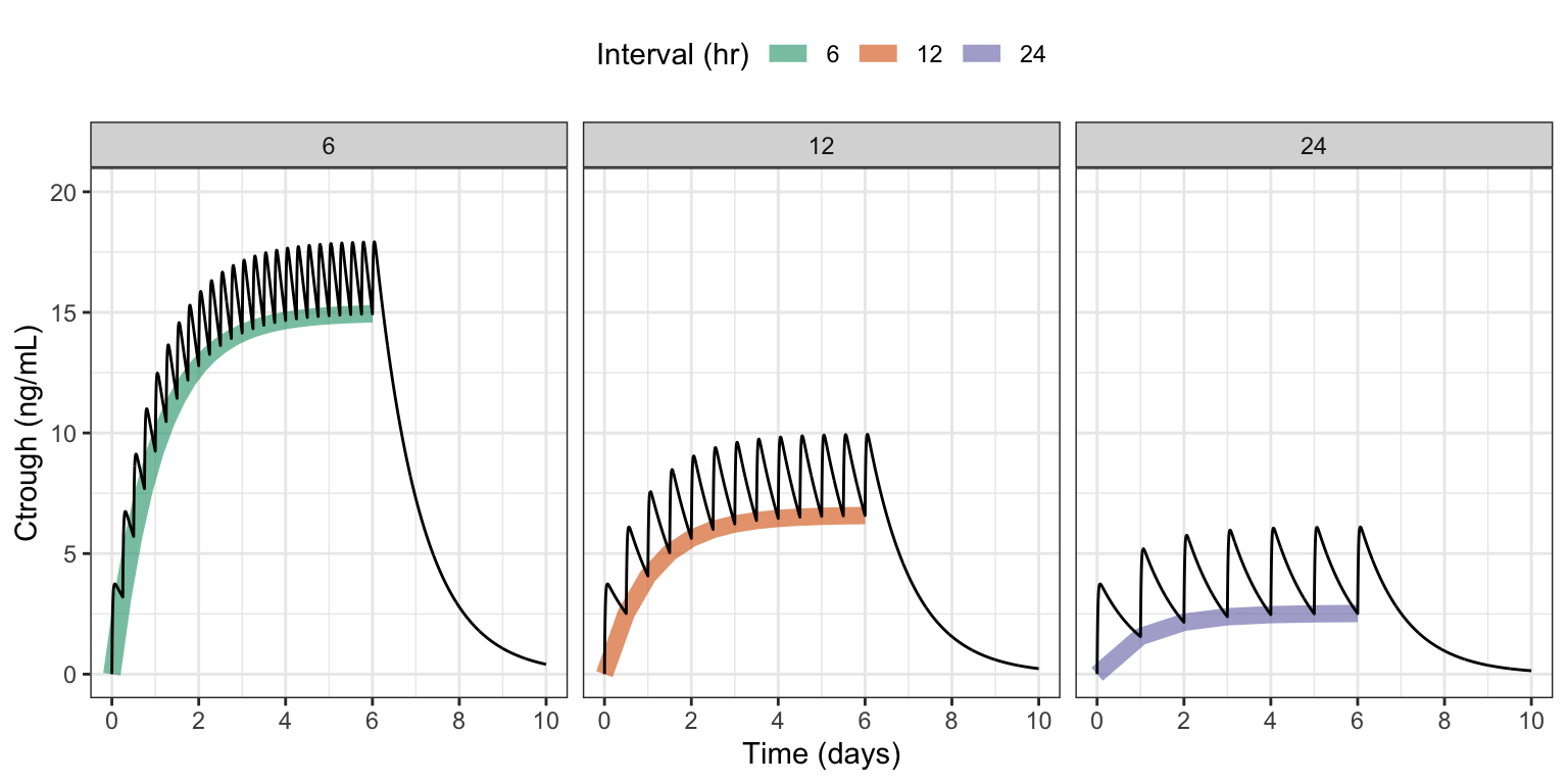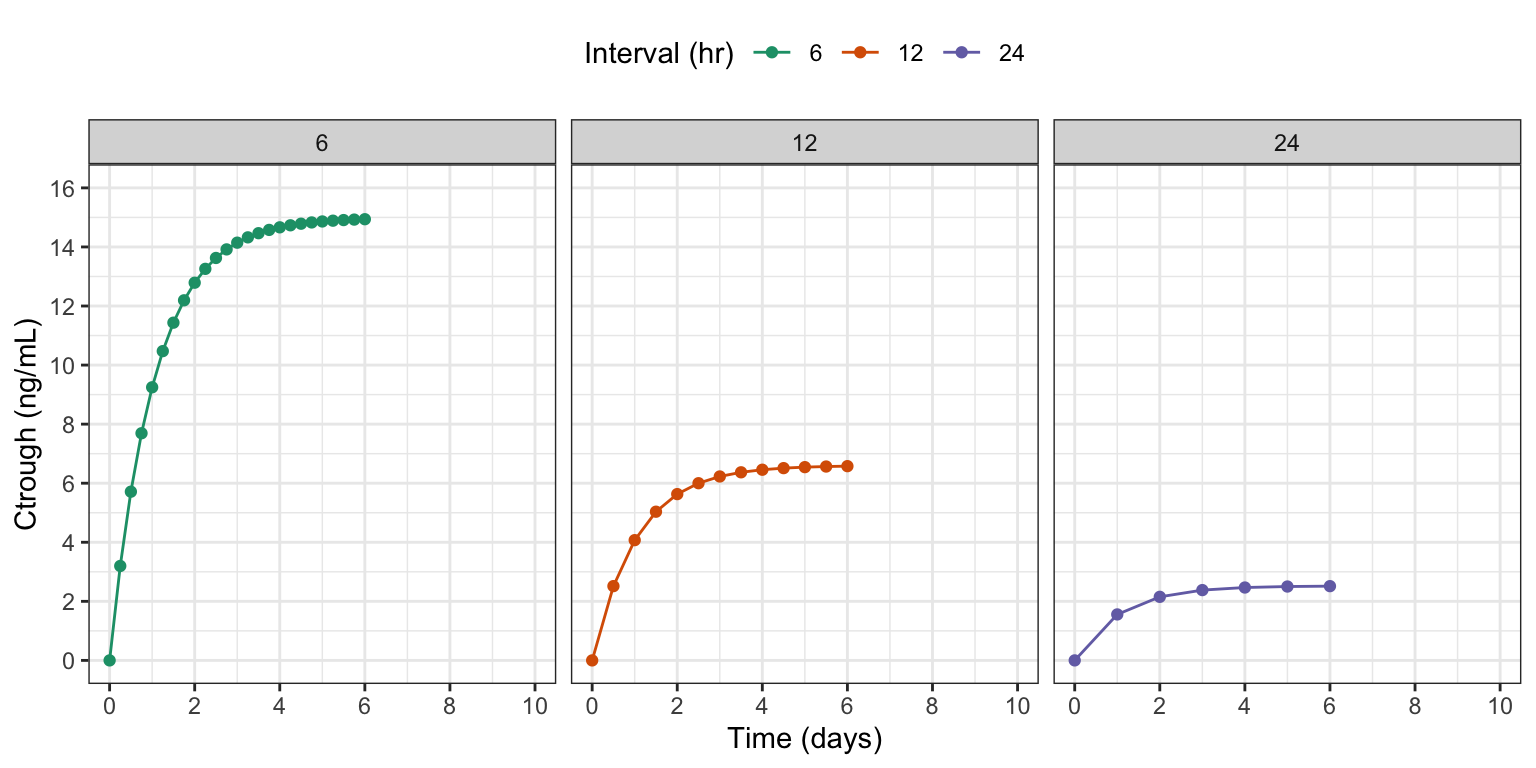 labs(x = "Time (days)", y = "Ctrough (ng/mL)", color = "Interval (hr)")