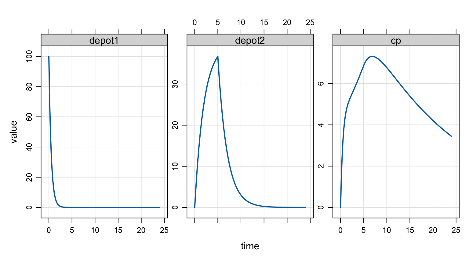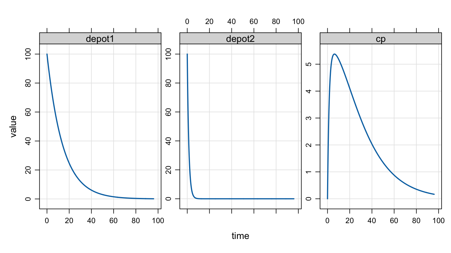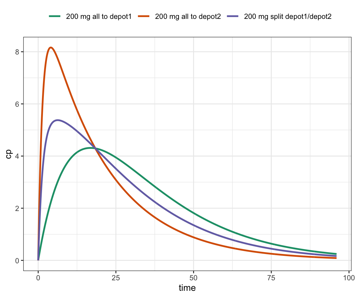 Now we see 100 mg going into depot1 with slow exit and 100 mg going into depot2 with faster exit. The way I’ve set up the example, the concentration increases much more quickly after adding the fast absorption through depot2 in combination with the slower absorption via depot1.