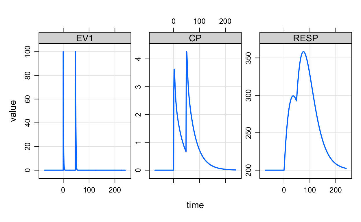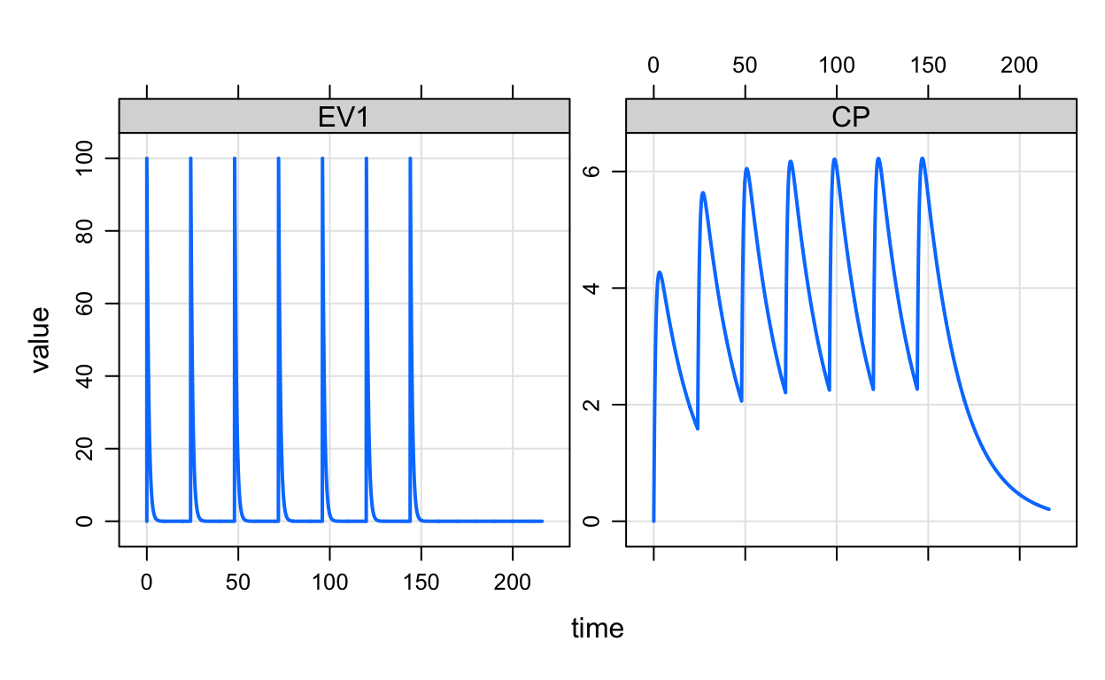 Event objects are a simple way to implement dosing or other interventions into your simulation. They are created with special constructors and elementary events can be combined in different ways to create complex dosing regimens.