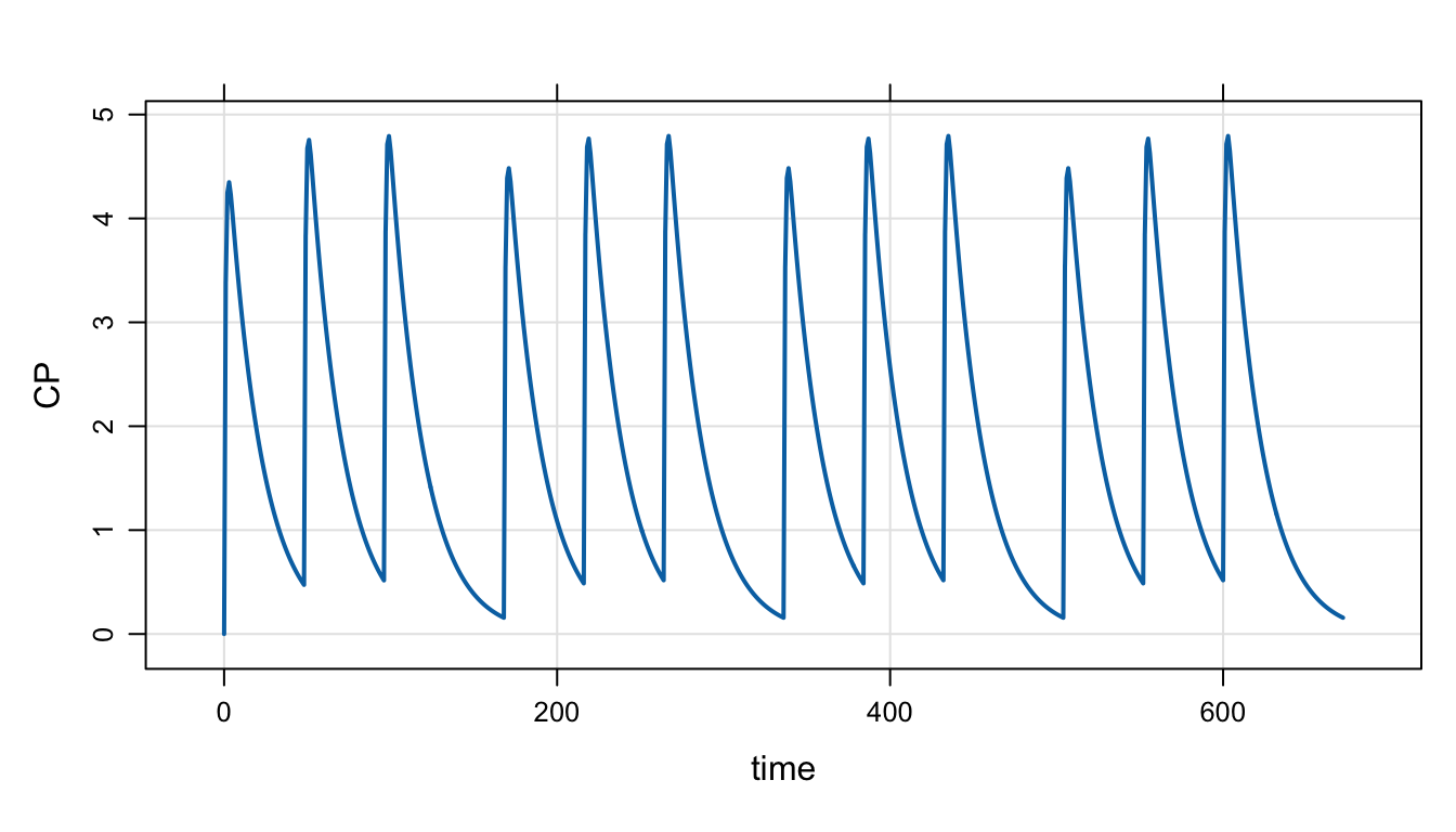mrgsim_e(mod, regimen) %>% plot("CP")More will be said about how to create and manipulate event objects in the following sections.