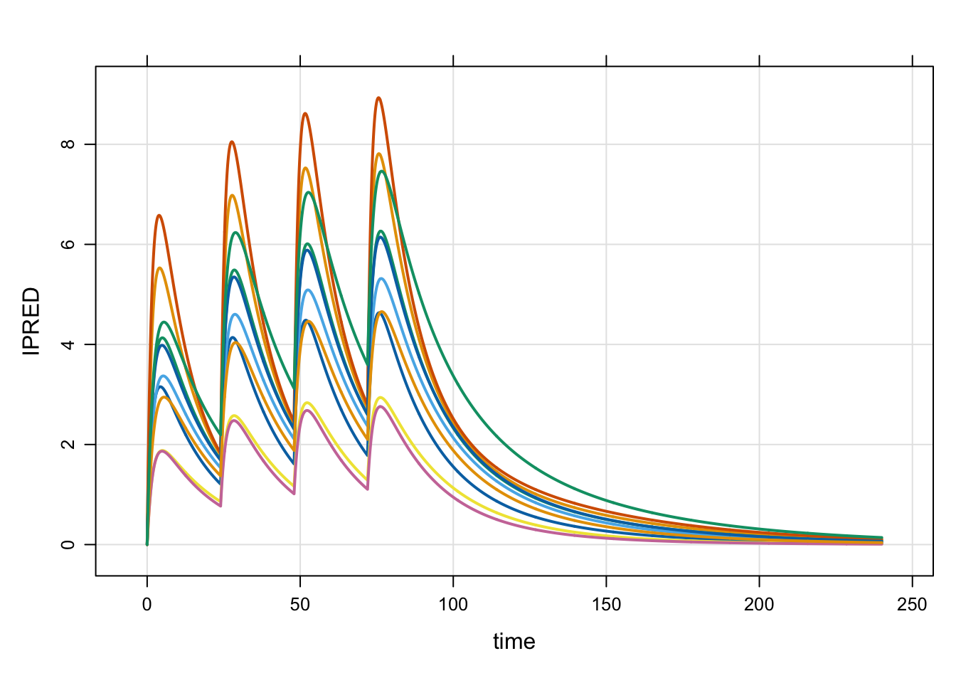The following is a simple example to illustrate the basics of how mrgsolve works. You can find more examples and usage vignettes in the links above or in the “Help Topics” menu in the nav bar at the top of the mrgsolve.github.io main page.